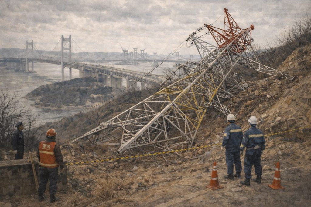 聖通寺山の送電塔、無残に倒壊 ── 坂出で前代未聞の送電妨害