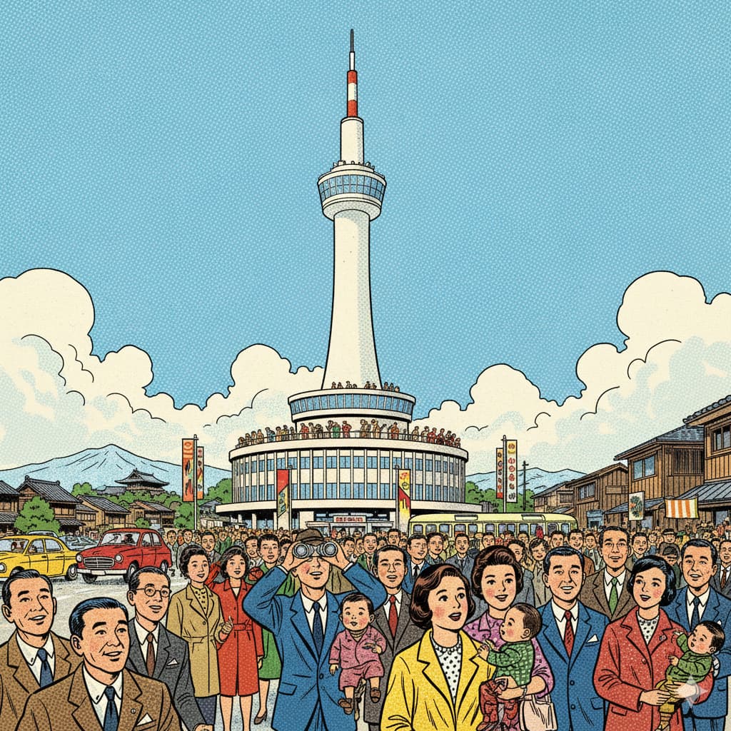 【京都 12月28日】 本日、京都駅前に建設された京都タワーの展望室が開業し、一般客の利用が始まった。白く細長い塔体は、伝統的な寺社建築が立ち並ぶ古都の景観の中で... -