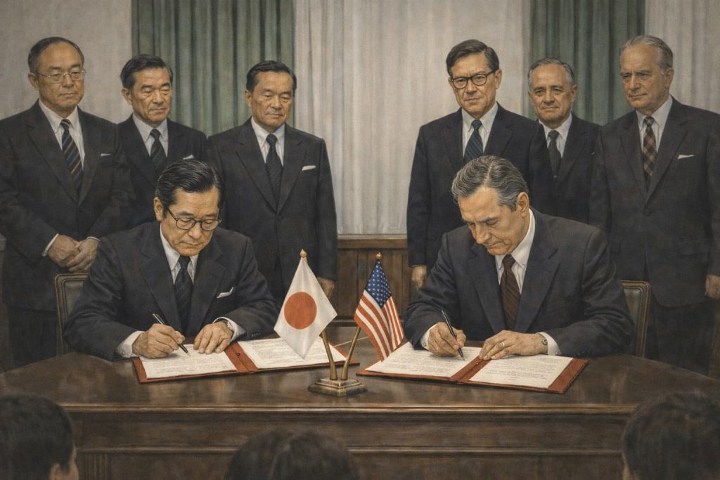 【ワシントン 1月3日】 日本とアメリカ合衆国は本日、繊維製品の対米輸出をめぐる摩擦の調整を目的とした日米繊維協定に調印した。急増する輸出が米国内産業に与える影... -