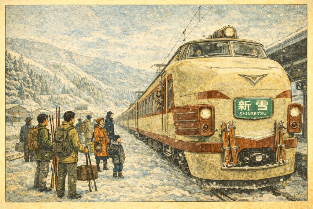 【東京 1月11日】 国鉄は本日、東京・上野駅と新潟県の石打駅を結ぶ臨時特急列車「新雪」の運転を開始した。首都圏と上越地方のスキー場を直結する列車として設定された... -