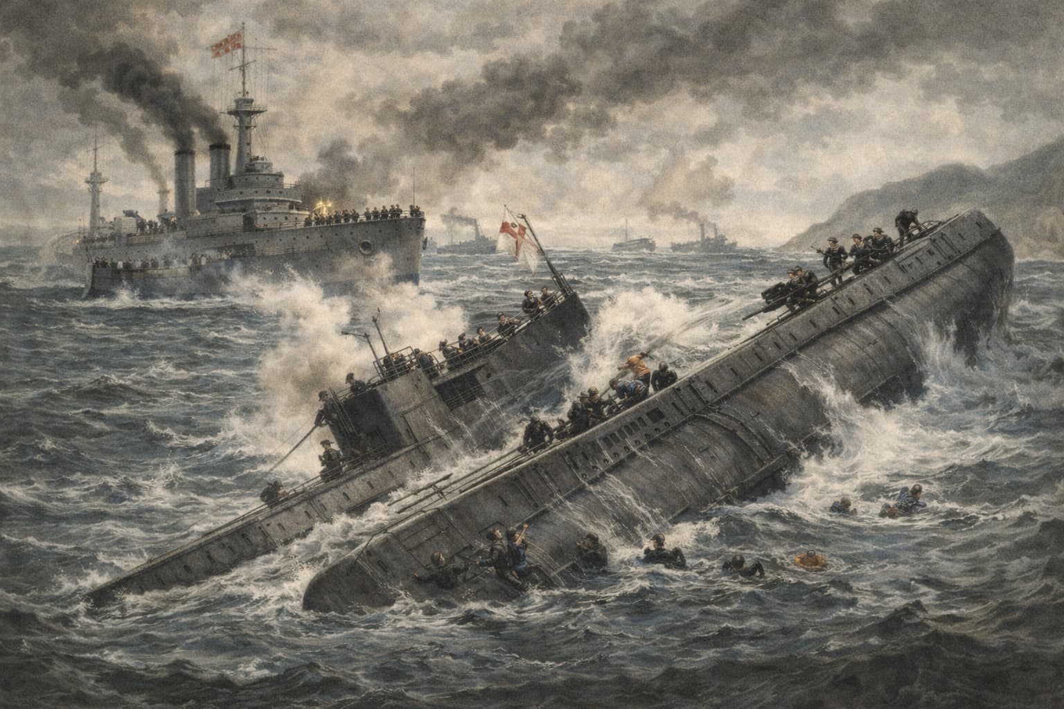 本日未明、スコットランド東方沖の北海において、演習に向かっていた英国海軍艦艇の隊列内で連続した衝突事故が発生し、潜水艦2隻が沈没する大惨事となった。事故は暗闇と霧に包まれた海域で起こり、複数の巡洋艦・駆逐艦・潜水艦が密集して行動していたことが被害拡大の一因とみられている。