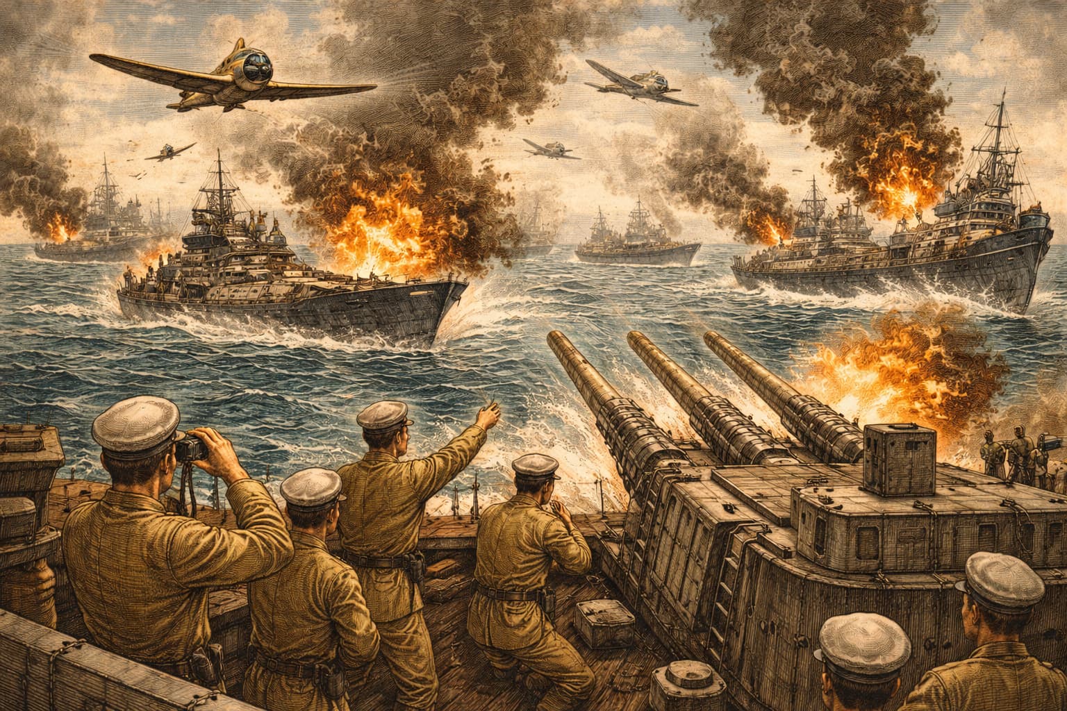 大本営海軍報道部は本日、ジャワ島攻略を目指すわが軍の輸送船団を護衛していた第三艦隊および第四水雷戦隊が、昨夜から今朝にかけてジャワ島北西部のバタビア(現ジャカルタ)沖において、米豪英蘭の連合軍艦隊(ABDA艦隊)と激突し、これを撃沈・撃破したと発表した。この勝利により、ジャワ島周辺の連合軍艦隊は事実上壊滅し、わが軍によるジャワ島上陸と南方資源地帯の確保は決定的な段階を迎えた。