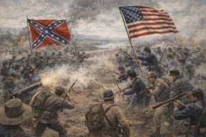 合衆国を二分する内戦は年の瀬を迎えても収束の兆しを見せず、本日、テネシー州中部のストーンズリバー一帯で北軍と南軍が激突した。平原と川沿いの林を舞台に激しい銃撃と砲撃が交錯し、双方ともに大きな損害を被りながら戦線を維持している。