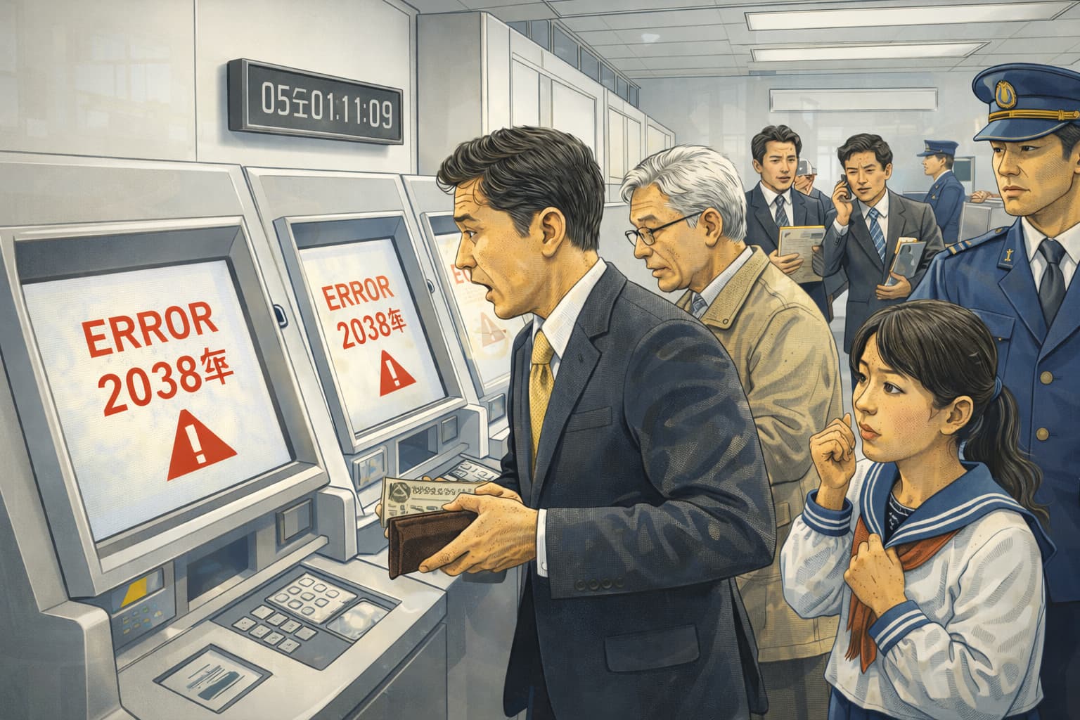 本日、国内の大手銀行や地方銀行の現金自動預け払い機(ATM)において、日付設定の誤りにより一部の取引が不能になるなどのトラブルが相次いで発生した。原因は、コンピュータが時刻を計る際に生じる「2038年問題」に関連したプログラムの不備と見られており、未だ記憶に新しい「西暦2000年問題」以来の深刻なシステム障害として波紋を広げている。