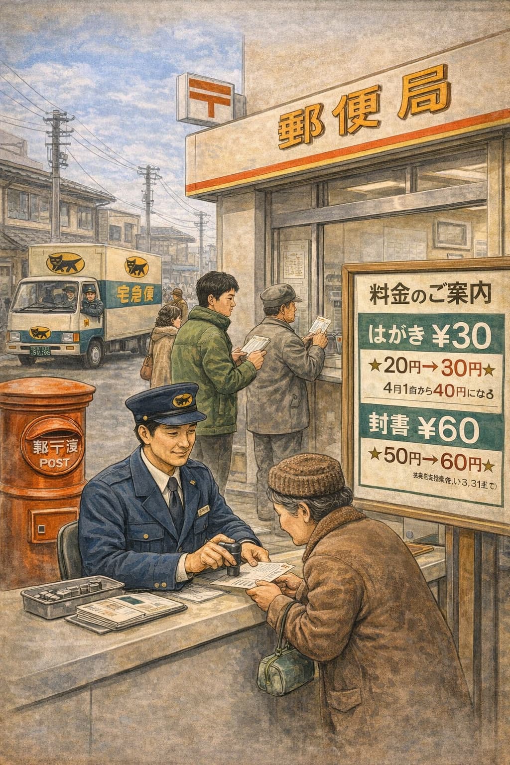 郵政省は本日、郵便料金の改定を実施し、はがきおよび封書の料金を引き上げた。これにより、通常はがきは従来の20円から30円へ、封書(25グラムまで)は50円から60円へと改定された。なお、はがき料金については経過措置として3月31日まで30円とし、4月1日からは40円に再度引き上げられる予定となっている。