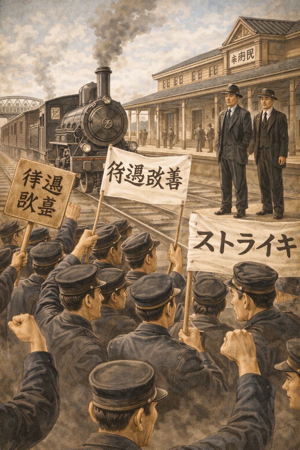 現場となった上野駅では、発車予定の列車が冷たい蒸気を吐き出すこともなく立ち往生し、足止めを食った乗客たちの怒声と困惑が渦巻いている。駅構内の片隅では、黒い作業着に身を包んだ機関士たちが腕を組み、固い決意を秘めた眼差しで線路を見つめている。あるスト参加者は「我々は炭にまみれ、命を預かって走ってきた。会社が我々を単なる機械の一部と見なすなら、その機械が止まった時の重みを知るべきだ」と、静かながらも力強い口調で語った。