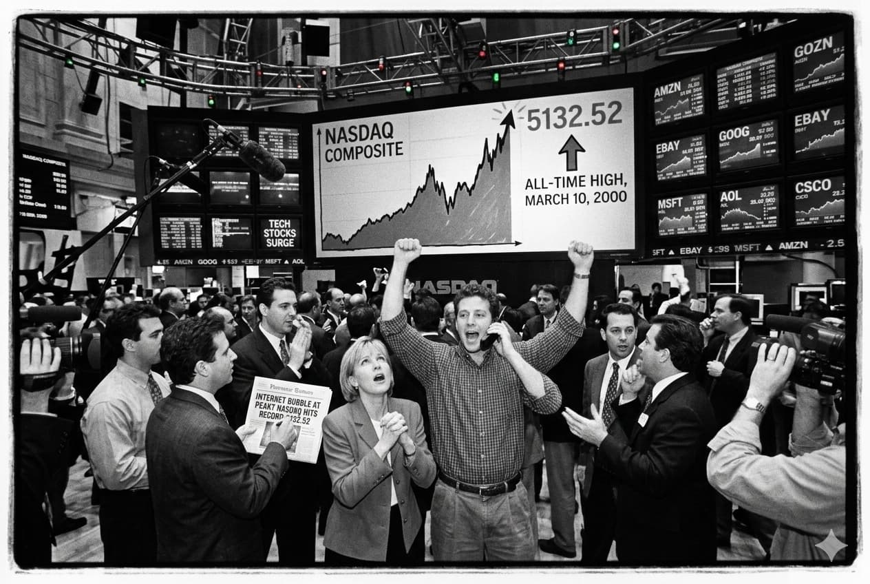 本日、ニューヨーク株式市場のナスダック総合指数は、取引時間中に史上最高値となる 5,132.52ドル を記録し、終値でも初めて 5,000ドル の大台を突破する 5,048.62ドル で取引を終えた。インターネットの普及が経済構造を根底から変えるという「ニューエコノミー」への狂信的な期待が、市場を未曾有の熱狂へと駆り立てている。