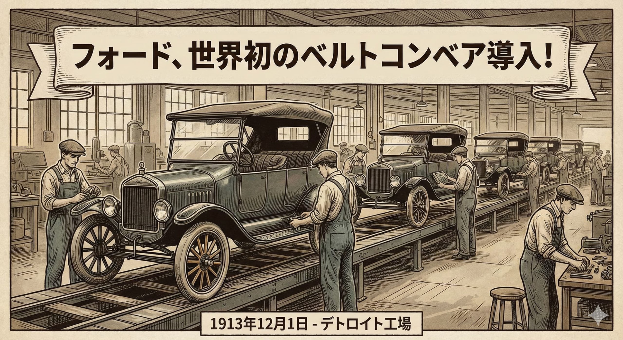 本日、米国ミシガン州デトロイトの自動車メーカー フォード・モーター社 は、ハイランドパーク工場において、世界で初めてのベルトコンベア式生産ラインを正式に稼働させた。これまで試験的に導入されてきた“流れ作業”の仕組みを大規模に本格運用するもので、自動車製造の歴史が大きく転換する瞬間となった。