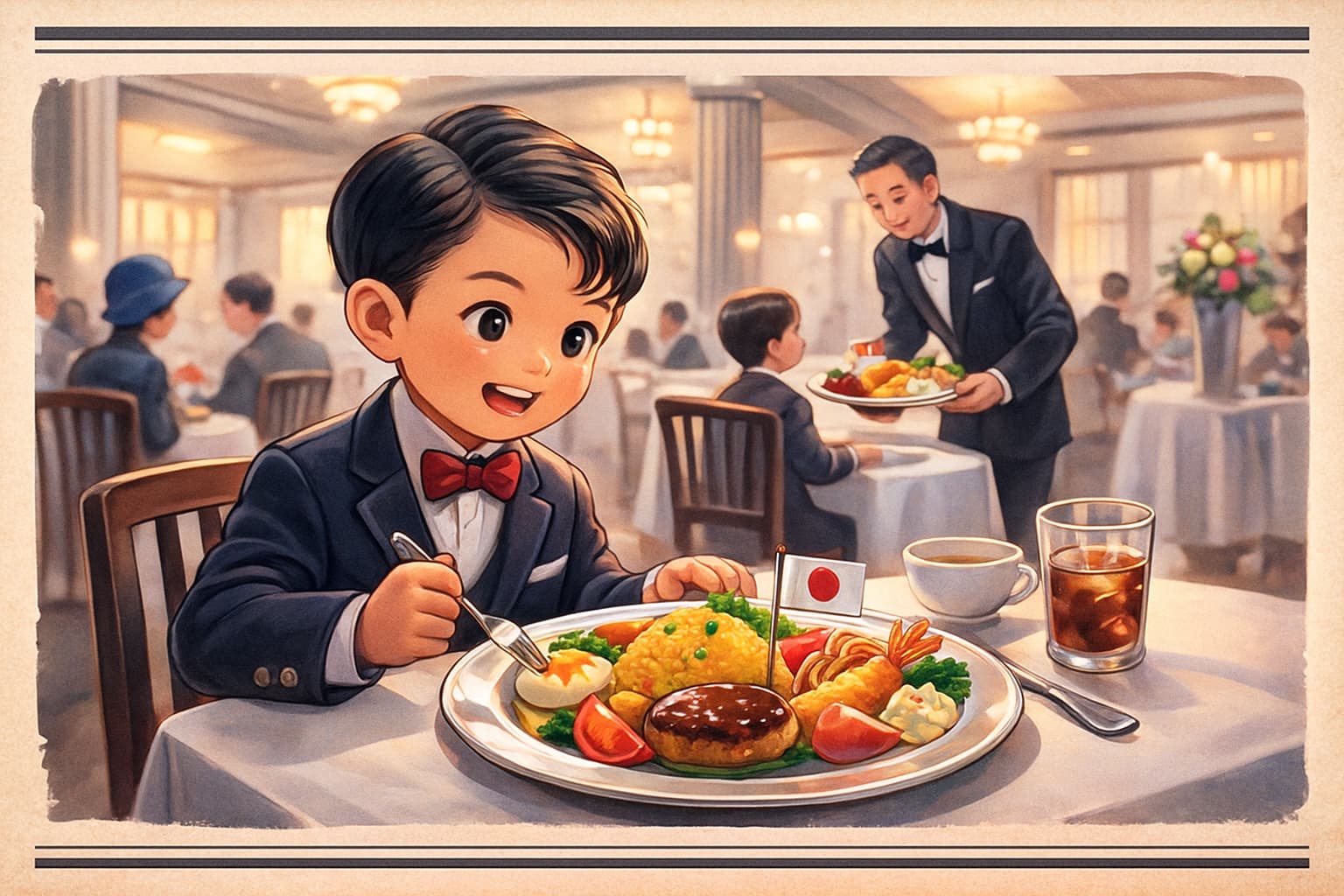 本日、日本橋三越の食堂部にて、子ども向けの特別料理として名付けられた「お子様ランチ」が初めて提供され、開店直後から多くの親子連れが訪れた。彩り豊かな洋食を一皿にまとめた新しい形式の料理は、これまでになかった趣向として注目を集め、食堂は昼前から賑わいを見せた。
