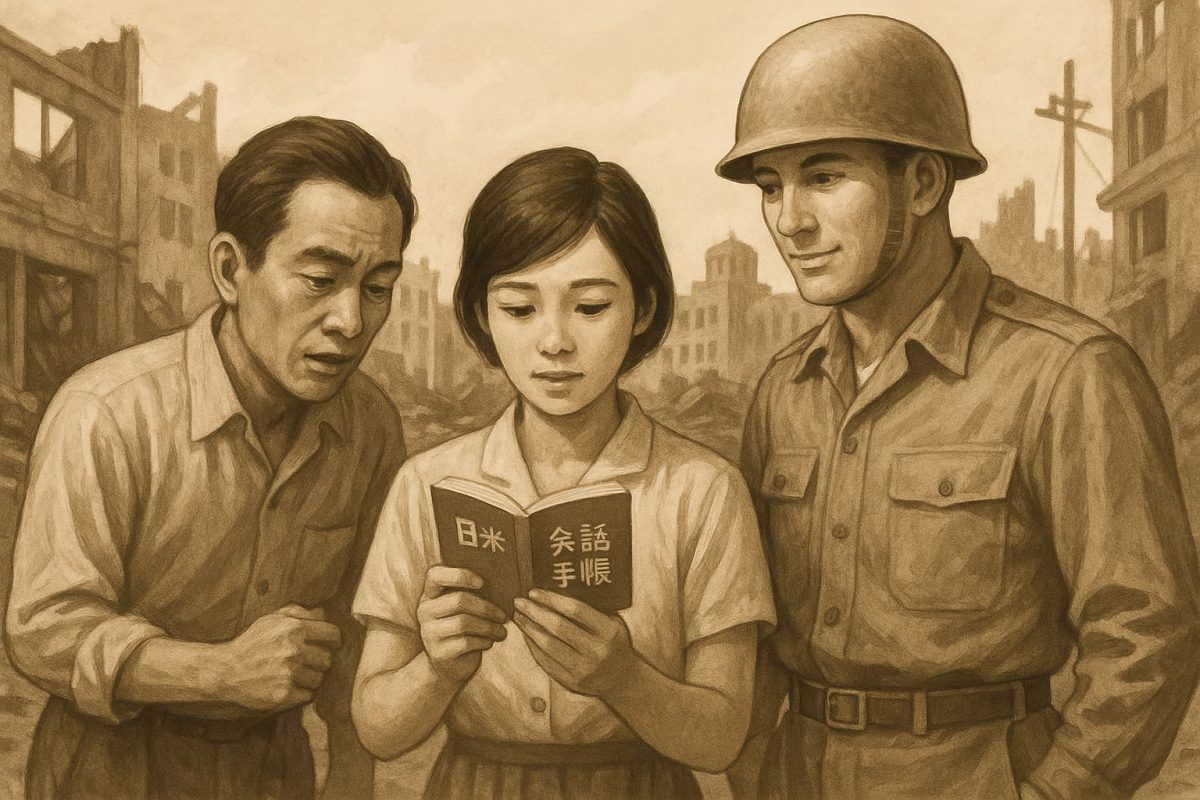 本日、日本語と英語の基本的な会話文を収録した小冊子『日米会話手帳』が、全国の書店や駅売店にて一斉に発売された。戦争終結から1ヶ月余り、アメリカ進駐軍の本格的な展開に伴い、市民と兵士の間に必要な「意思疎通」の手段として注目が集まっている。
