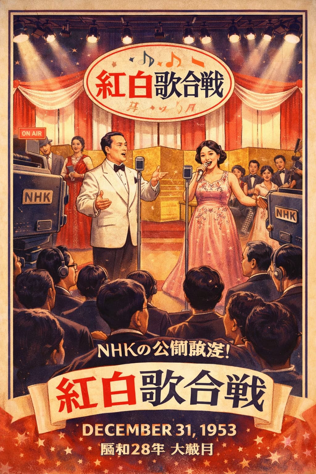 年の瀬の本日、紅白歌合戦が初めて公開放送として実施され、放送の時間帯も大晦日に定着することとなった。会場には多くの観覧者が集い、年越しを前にした高揚感の中で歌声と拍手が響いた。