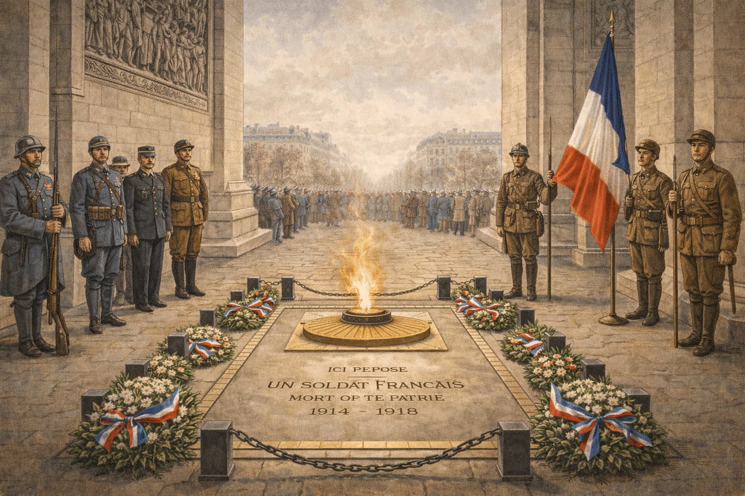 フランス政府は本日、パリの象徴であるエトワール凱旋門の直下に、第一次世界大戦で戦死した名もなき兵士を悼む「無名戦士の墓」を設ける式典を執り行った。これは、大戦で祖国のために命を落とした数多の兵士を国家として顕彰するための恒久的な慰霊施設である。