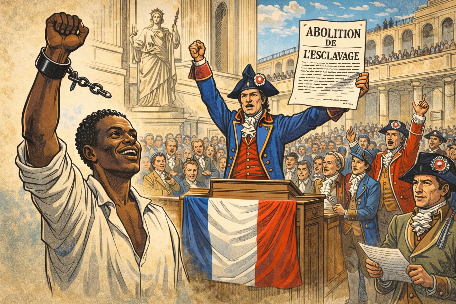 この決定は、革命の理念として掲げられてきた「自由」と「平等」を、国内にとどまらず海外領土にも適用するものだ。討議の場では、サン=ドマングなど植民地で続く混乱と戦況が報告され、武装蜂起に参加する黒人兵士の忠誠を確保する狙いも背景として語られた。議場では賛同の声が相次ぎ、採決は拍手と歓声に包まれた。