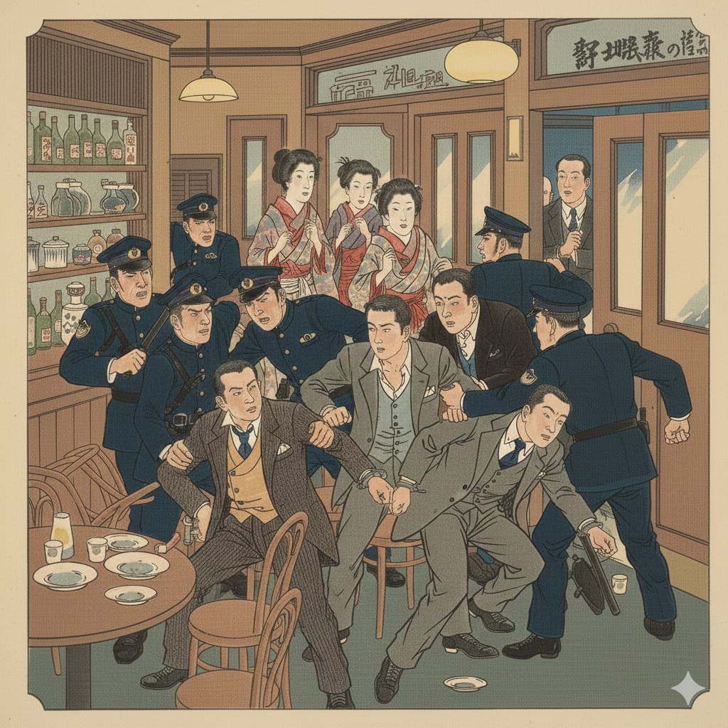 警視庁は本日夜、東京都下のカフェー、バー、喫茶店などを対象に大規模な一斉取締りを実施し、風紀を乱す行為に及んでいたとされる学生ら約二千人を検挙したと発表した。