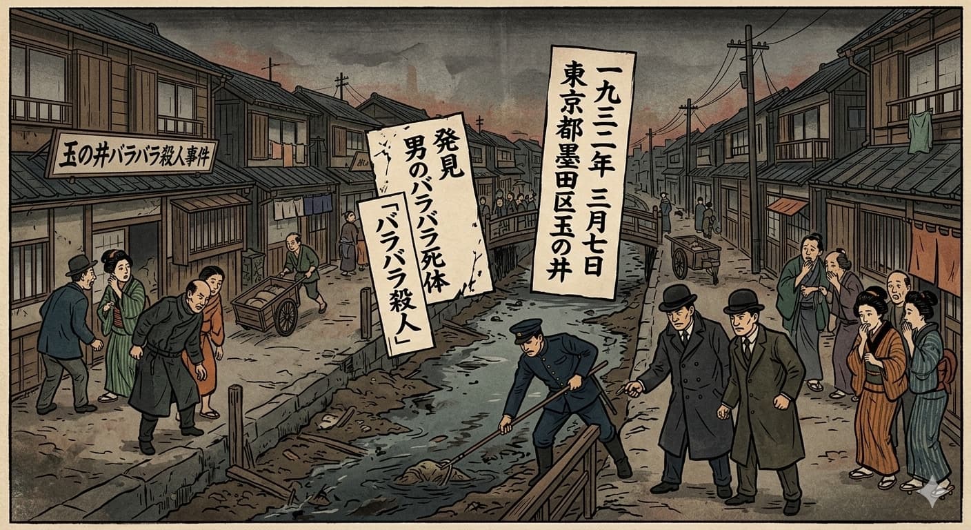 本日午前、向島区寺島町の俗称「玉の井」付近を流れる、通称「お歯黒どぶ」において、見るも無惨な男性の切断遺体が発見された。遺体は頭部、胴体、手足が鋭利な刃物によって切り離されており、変わり果てた姿で泥水の中に沈んでいた。この猟奇的な犯行手口に、周辺住民のみならず帝都全域が深い戦慄に包まれている。