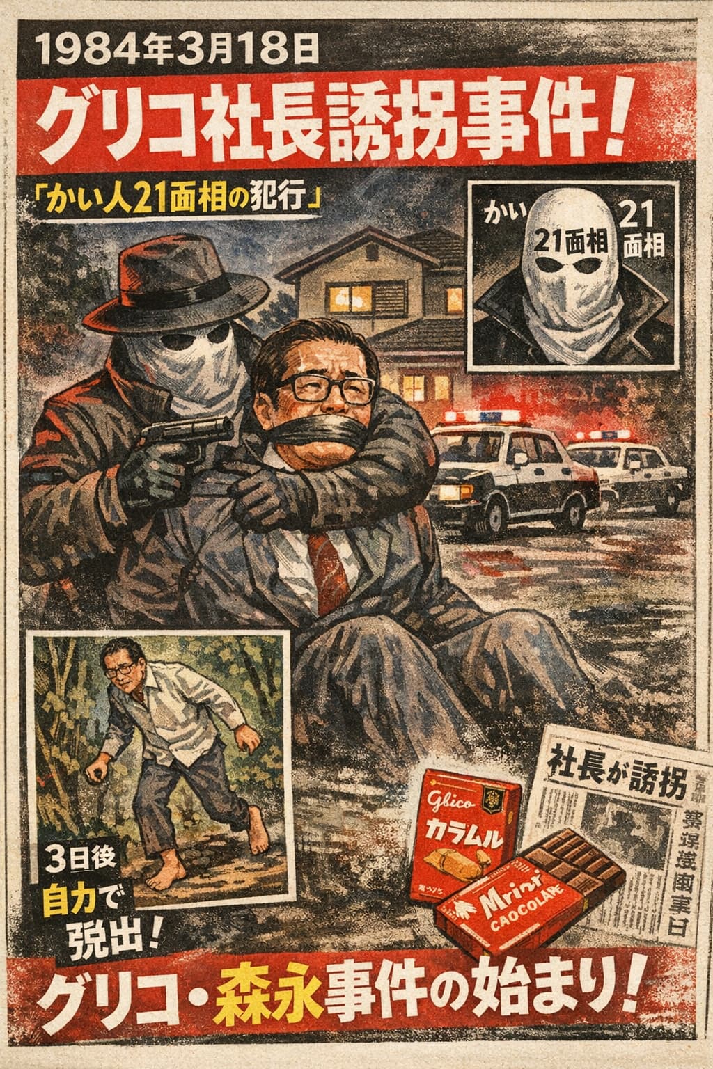 この事件は、「グリコ・森永事件」として日本全土を震撼させる一連の事件の最悪の第一歩となった。社長は3日後に自力で脱出に成功することになるが、犯人グループによる「挑戦状」の送付や商品への毒物混入予告など、見えない敵との戦いはここから泥沼化していく。1984年の日本に突如として現れた「21面相」の影は、高度経済成長を遂げた社会の脆さを嘲笑うかのように、人々の平穏を突き崩している。