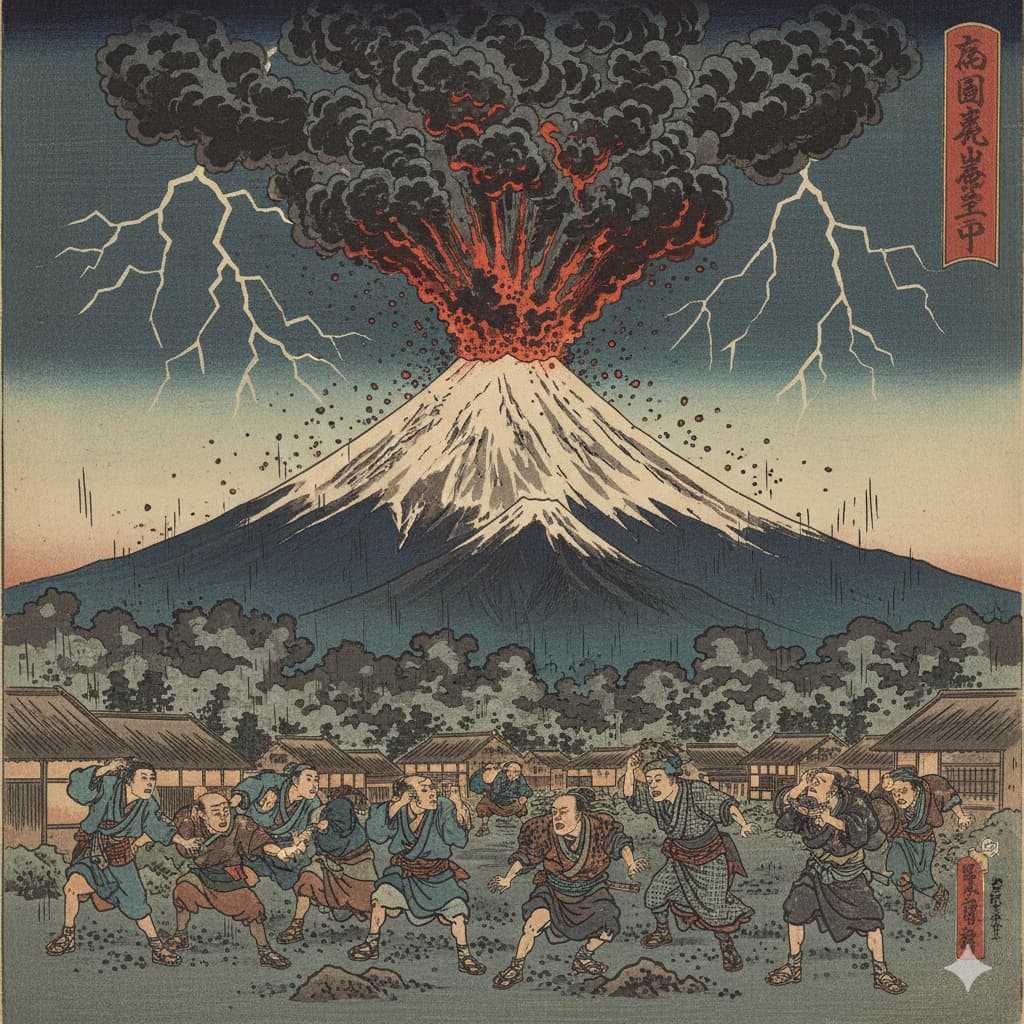 本日午前、富士山が突如として激しい噴火を起こし、山腹に巨大な新火口が開いた。 周辺村々では降灰が昼夜の区別を失わせるほど降り続き、東国一帯に不安が広がっている。火口は南東斜面に形成され、早くも「宝永山」と呼ばれ始めている。