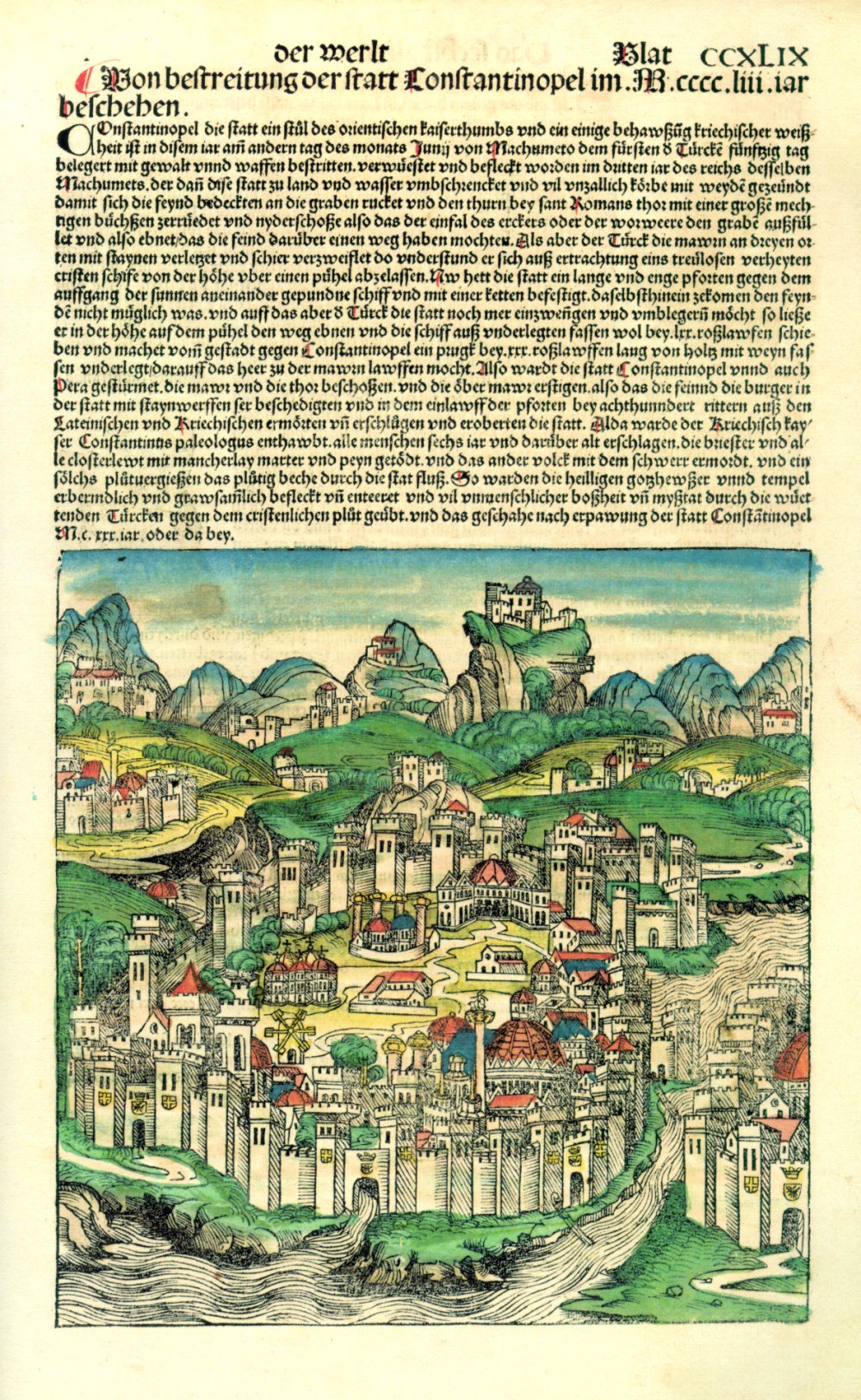 同書は、医師で人文主義者のハルトマン・シェーデルが編纂したもので、古代・聖書史・中世史を一体として叙述する点に特徴がある。今回のドイツ語版では、ラテン語原典をもとに、一般市民にも理解しやすい言語で歴史を伝えることが意図されている。挿絵には多数の木版画が用いられ、都市景観や歴史的人物の姿が視覚的に表現されている。