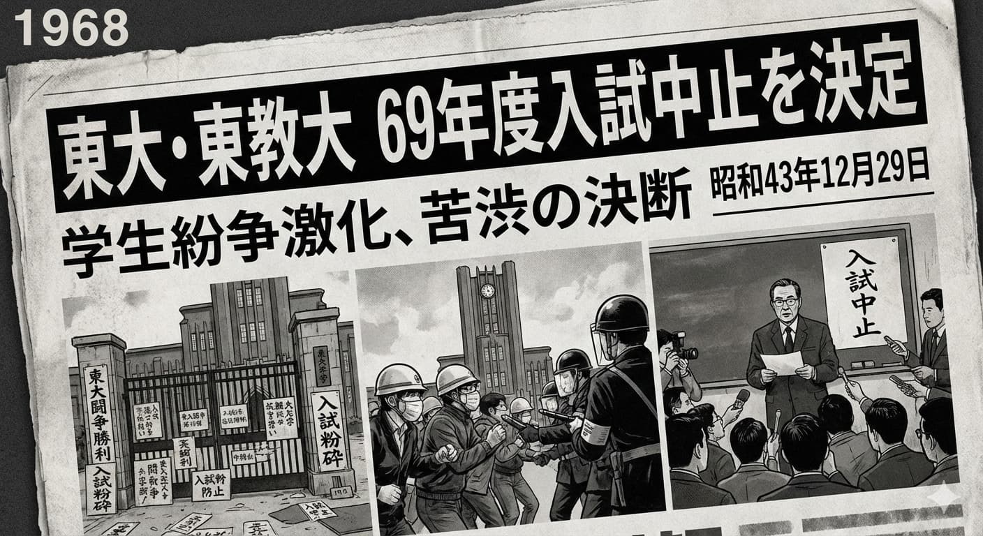 大学構内で続く学生紛争の影響を受け、東京大学および東京教育大学は本日、翌年に予定していた入学試験を中止する方針を相次いで決定した。全国的にも例を見ない異例の措置であり、高等教育の現場に大きな衝撃が広がっている。