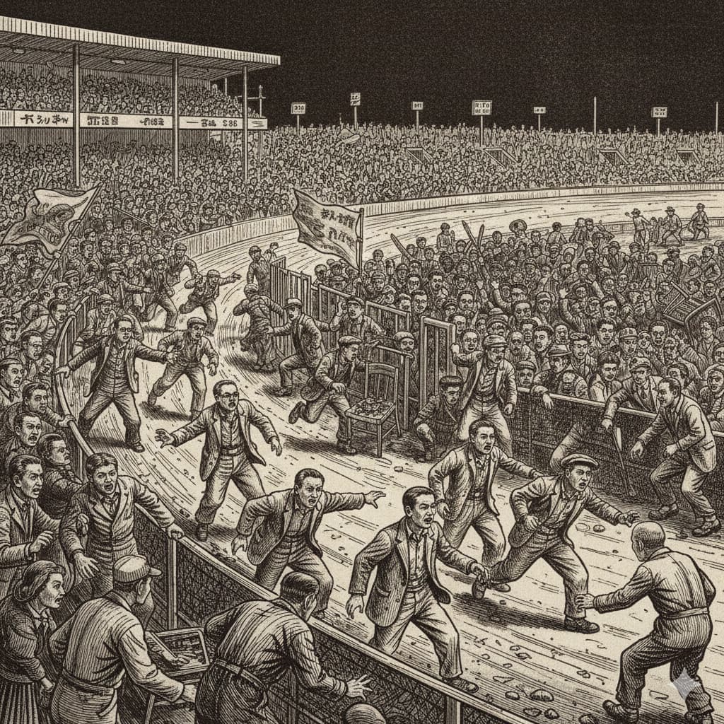 騒ぎは、最終レース直後に特定選手の不自然な走行や着順をめぐり、一部観客が強く反発したことから始まった。怒号と罵声が飛び交う中、観客の一団が柵を乗り越えてコース内へ侵入。これに呼応するように群衆が殺到し、投票所や施設の一部が破壊されるなど、場内は一時完全に制御不能となった。