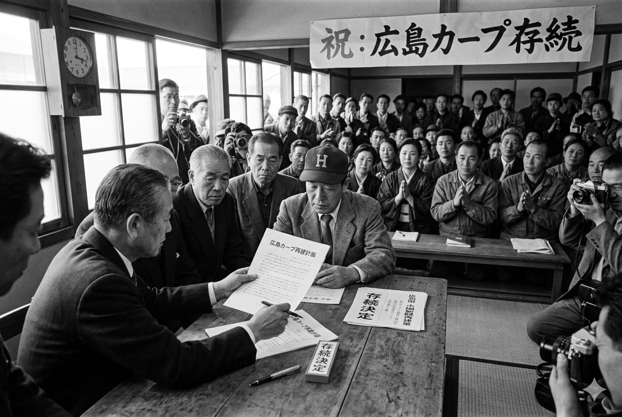 深刻な資金難から解散・合併の危機に瀕していたプロ野球・広島カープは本日、広島県および中国新聞社などが提示した強力な再建策を受け入れ、球団の存続を正式に決定した。一時は大洋ホエールズへの吸収合併が確実視され、関係者が「解散届」を携えて上京する直前まで追い詰められていたが、広島の街から野球の灯を消してはならないという地元経済界と市民の執念が、土壇場での逆転劇を生んだ。