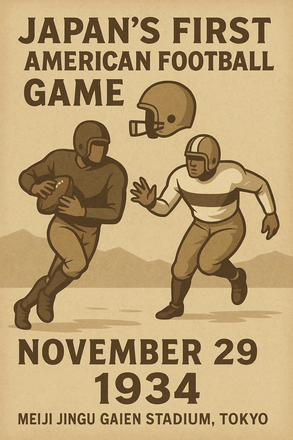 本日午後、東京・明治神宮外苑競技場にて、わが国で初めてのアメリカンフットボール競技の試合が開催された。米国発祥の新しい球技として関係者の間で注目を集めていたが、正式な試合として公開されるのはこれが初めてであり、学生や在留外国人ら多数の観客が詰めかけ、競技場には独特の緊張と期待が漂った。