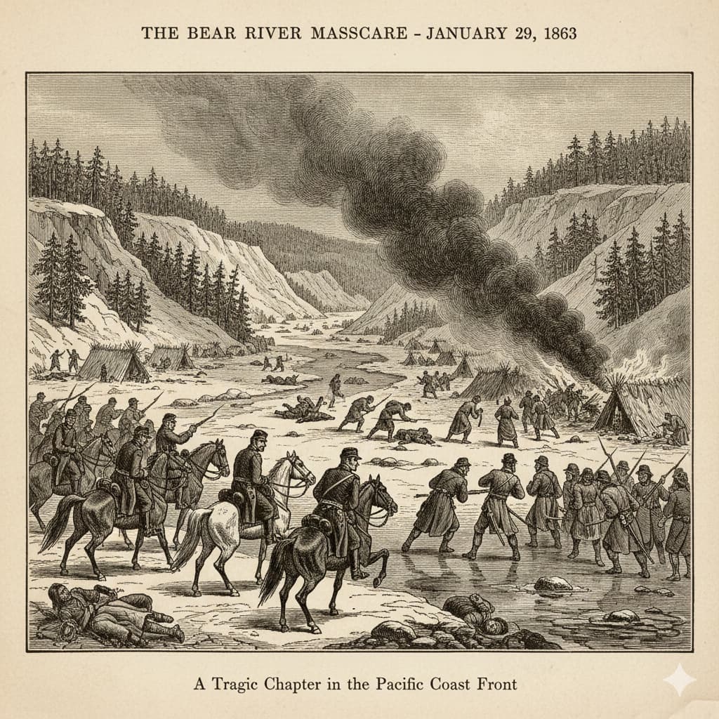 【アイダホ準州 1月29日】 太平洋岸戦線の一環として、合衆国陸軍部隊がベア川沿いのショーショーニー族集落を襲撃し、多数の先住民が殺害される惨事が起きた。現地から... -